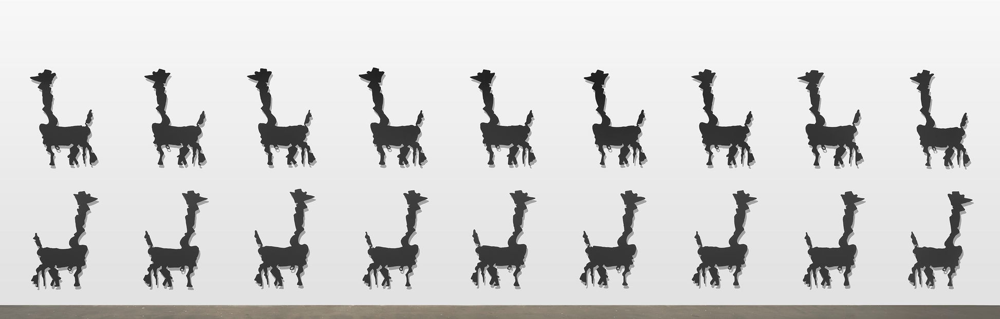 Rmsina Daniel, Processional Way, 2025, eighteen mild steel and micaceous iron oxide enamel figures, dimensions variable - installed 3290x13090x30mm